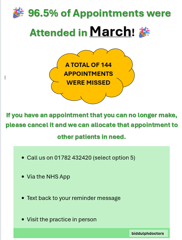 We would like to extend a huge thank you to all of our patients who attended their appointments in March. Your commitment to keeping your appointments is essential in helping us provide the best care possible. ![]()